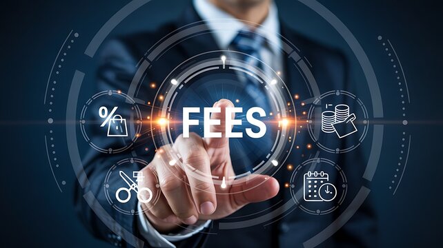 Businessman s finger touching a digital interface displaying the word fees surrounded by financial icons and data visualizations