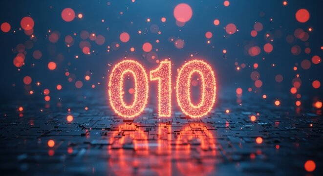 Bright red binary code '010' shines on a dark, reflective circuit board background, complemented by blurred bokeh lights. Illustrates modern digital technology.