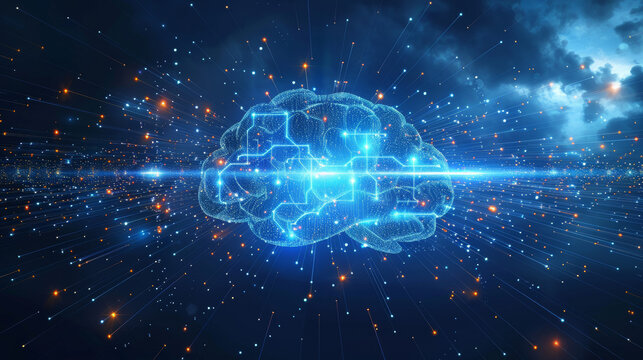 Abstract digital representation of human intelligence with glowing brain, neural connections, and futuristic concept of artificial intelligence, innovation, and technology