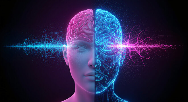 abstract illustration of human and artificial intelligence collaboration, futuristic minimal design with glowing connections
