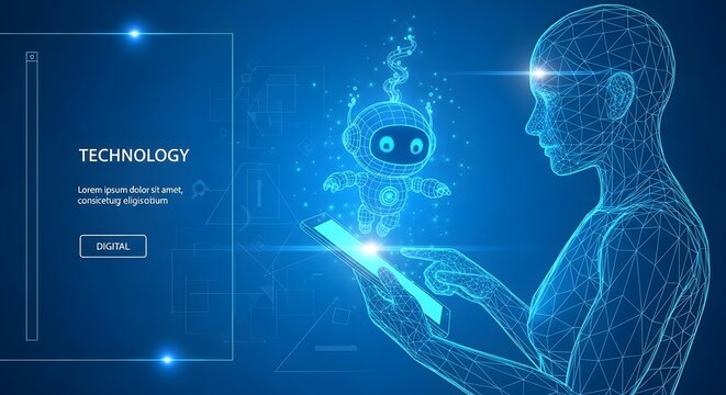 Illustration of futuristic digital hologram of a human interacting with a small robot, representing artificial intelligence and technology