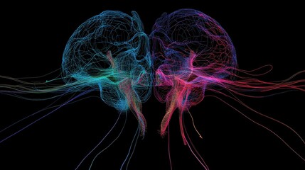 A vivid, digital representation of a human brain with glowing red and blue neural pathways against a dark background.