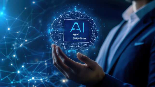Businessman holds futuristic ai chip with glowing neural network overlay technology innovation concept