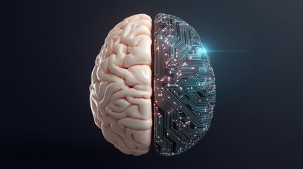 Growth through Innovation: Human brain merges with AI circuitry in a conceptual split visualization.