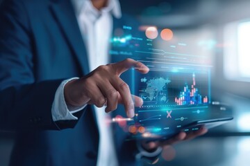 Businessman analyzing data with futuristic digital charts in office