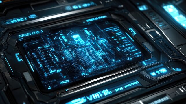 Futuristic digital interface displaying charts and network diagrams on a dark background with circuit board patterns.