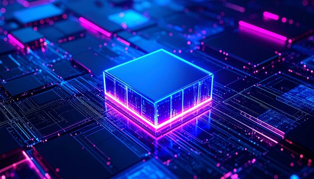 Abstract digital circuit board background with neon lights, blue and red hues, representing technology, data, and electronic systems in a futuristic design.