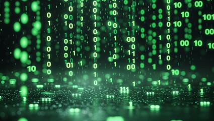 Abstract digital rain of green binary code cascading on a futuristic circuit board background