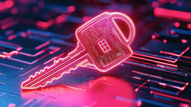 A glowing key icon is displayed on a digital circuit board, symbolizing security and technology in a vibrant, futuristic design.