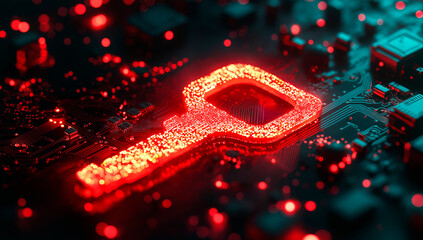 Glowing digital padlock on futuristic circuit board, symbolizing security and technology