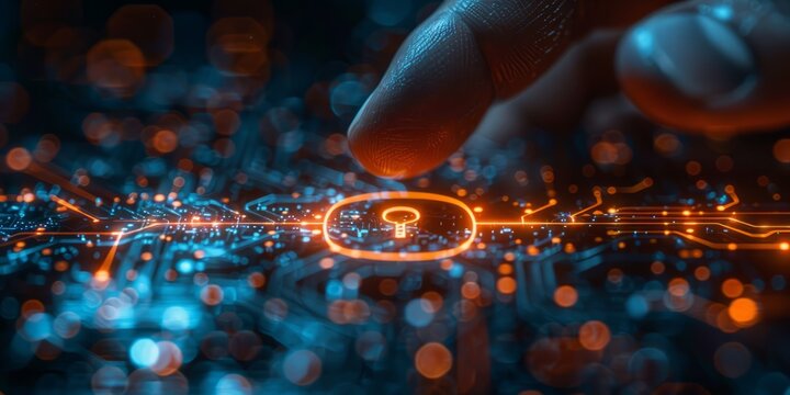 Finger interacting with a glowing digital key symbol on a futuristic circuit board, symbolizing cybersecurity