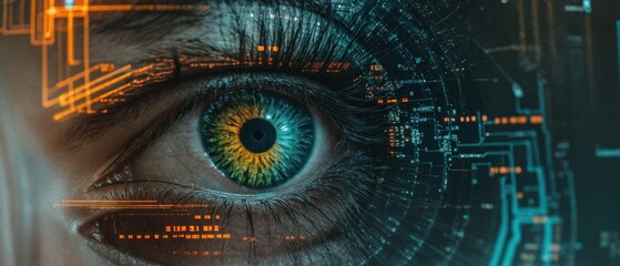 Futuristic circuitry patterns intertwine with digital code on a human eye