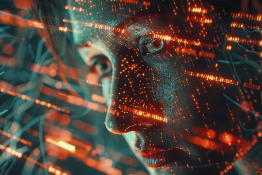 Digitally enhanced profile of a man with a futuristic blue and red neon overlay, merging with elements of digital data and circuitry against a dark, technological background.