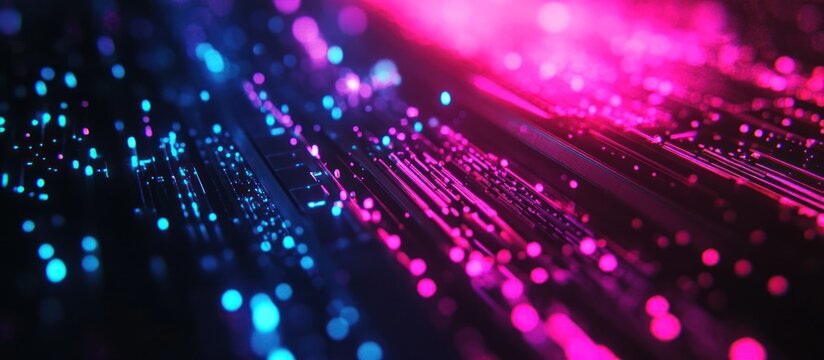 Abstract glowing circuit board with blue and pink neon lights.