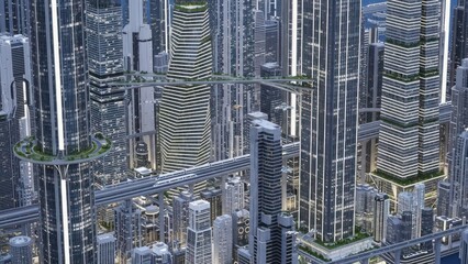 Futuristic digital cityscape with glowing neon elements and abstract architecture