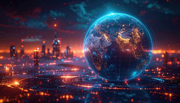 Futuristic digital technology interface with spinning globe