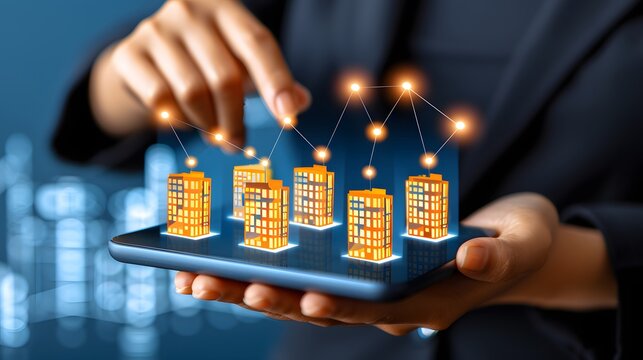 Businessman interacting with a futuristic holographic cityscape displaying smart city technology and real estate icons