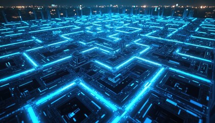 Abstract tech scene with neon blue lights. Digital futuristic labyrinth illuminated. Cyberpunk cityscape design with intricate structure. Night scene with glowing elements. Tech concept illustration