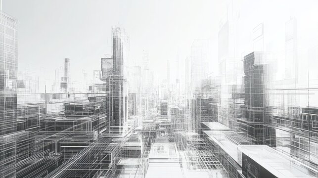 A futuristic cityscape rendered in digital wireframes, showcasing the integration of Building Information Modelling (BIM) technologies