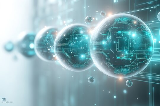 Abstract digital spheres with circuit board patterns, glowing with blue light.