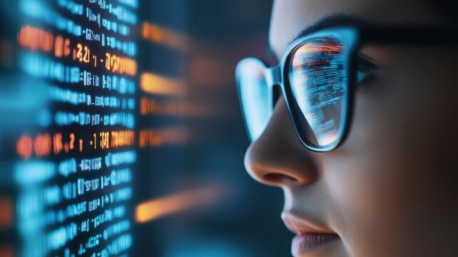Woman's face with data overlay near digital screen.