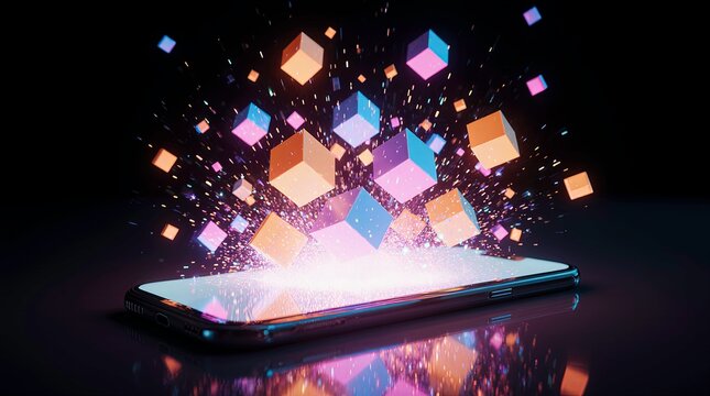 Smartphone lying on a smooth reflective surface, neon speech bubbles and chat icons emerge in a dynamic burst of light form a rainbow, symbolizing digital communication and connectivity.