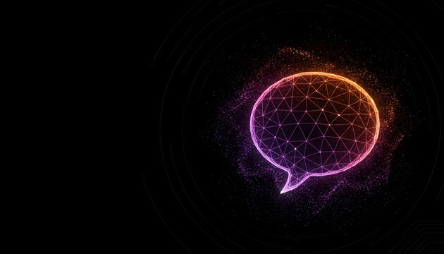 Glowing polygonal chat bubble icon representing digital communication and AI technology.