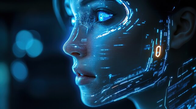 Futuristic Digital Female Face with Glowing Technology Data Interface Art
