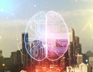Glowing digital brain hovers over cityscape at night, symbolizing fusion of technology and urban life. illuminated brain represents innovation and futuristic concepts