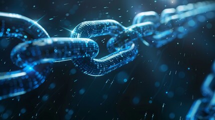 An image featuring a close-up of digital chain links integrated with flowing data particles, representing the interconnectedness of digital blockchains and technology.