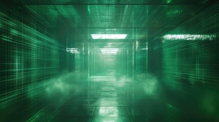 Digital corridor with glowing green grid lines and a foggy floor creates a conceptual journey through technology, artificial intelligence, and virtual reality spaces