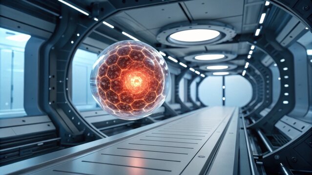 A futuristic scene featuring a glowing orb in a sleek, high-tech corridor with round ceiling lights.