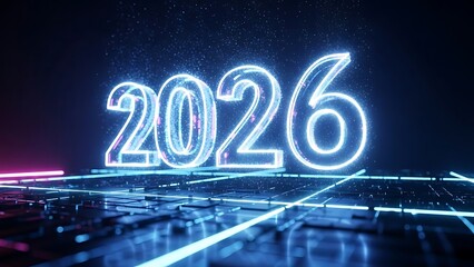 Glowing neon 2026 new year design on a futuristic grid background for technology and innovation projects symbolizing the future and upcoming trends in technology