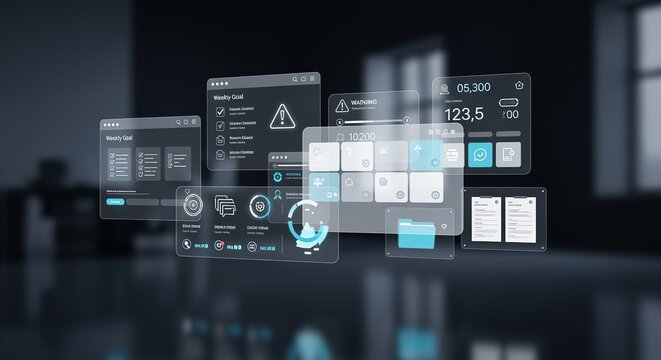 Digital interface with dashboard elements for data analysis, business intelligence, and project management on a dark background on transparent background