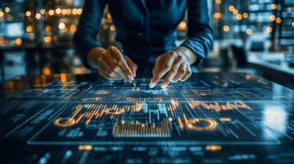 Woman analyzing digital information on a futuristic interactive display