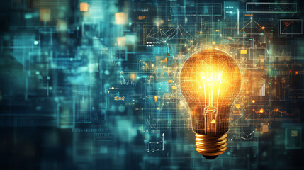 glowing light bulb surrounded by digital data and graphs symbolizes innovation and technology. vibrant colors and abstract elements create futuristic atmosphere