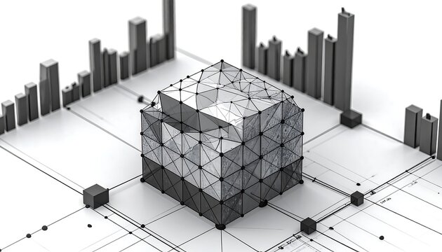 Abstract monochrome cityscape with intricate geometric shapes, bars, and dots representing financial growth and data visualization in a futuristic setting