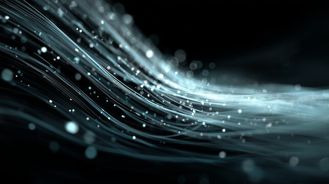 Futuristic AI data signal waves with glowing particles in dark sci-fi atmosphere, premium tech abstract background with copy space