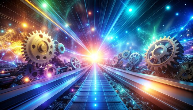 Glowing neon grid lines form a colorful digital tunnel suggesting fast data flow, network connectivity and futuristic visualization for technology, internet and big data concepts