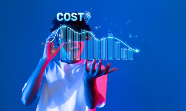 A businessman stands with a futuristic digital interface displaying cost reduction trends, symbolizing innovation and strategy in finance and business analysis. XDMCP
