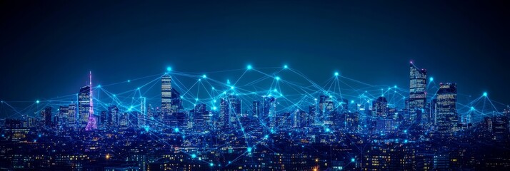 Modern digital cityscape with glowing lines shows connection. Futuristic city downtown with skyscrapers over blue background. Perfect for sci-fi, tech, digital network concepts. Urban innovative