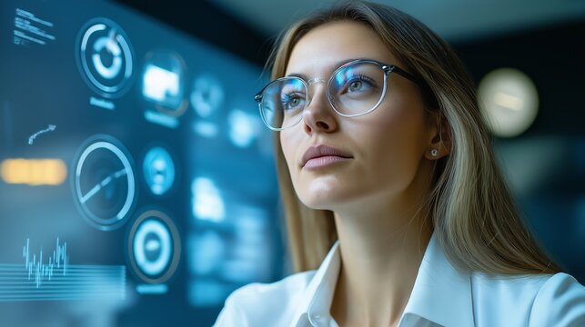A woman wearing glasses is looking at a computer screen with a lot of graphs and numbers. Concept of focus and concentration as the woman studies the data displayed on the screen