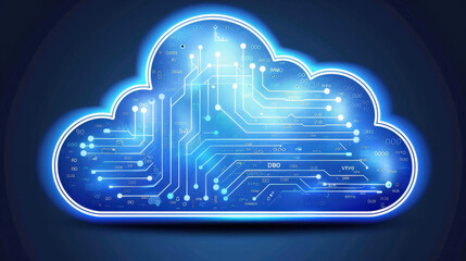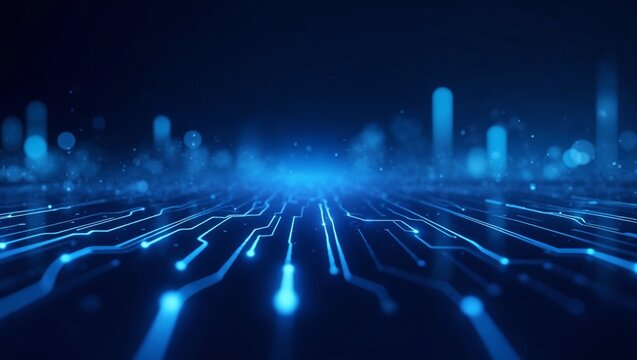 Digital circuit board with glowing connections in blue tones