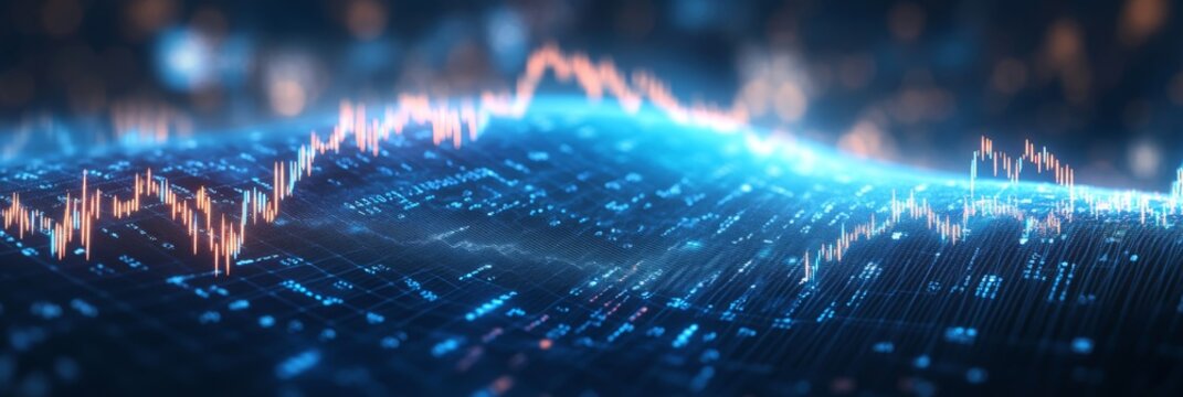 Abstract digital landscape with glowing lines and waves in blue tones.