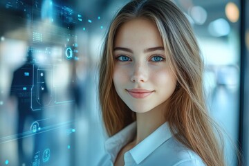 Woman's face overlaid with a futuristic AI interface, showcasing technological integration and facial recognition.
