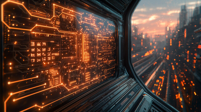 Futuristic control panel with glowing circuit patterns overlooking a vibrant sci-fi cityscape at sunset
