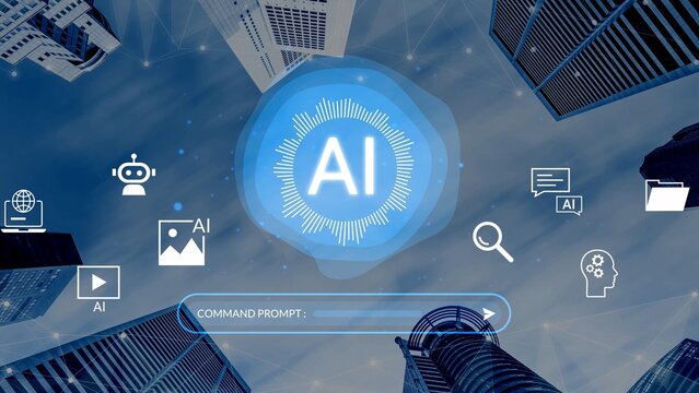 A cutting-edge control room with illuminated blue displays, overlooking a city skyline with wind turbines and technology.