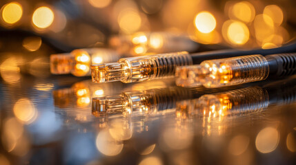 Network cables with glowing connectors reflecting on a surface surrounded by warm bokeh lights creating a tech-focused and atmospheric composition