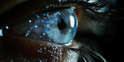 Close-up of a blue eye reflecting digital data, symbolizing technology and vision