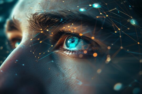 eye reflecting information, graphics, symbolizing technology and artificial intelligence helping humanity